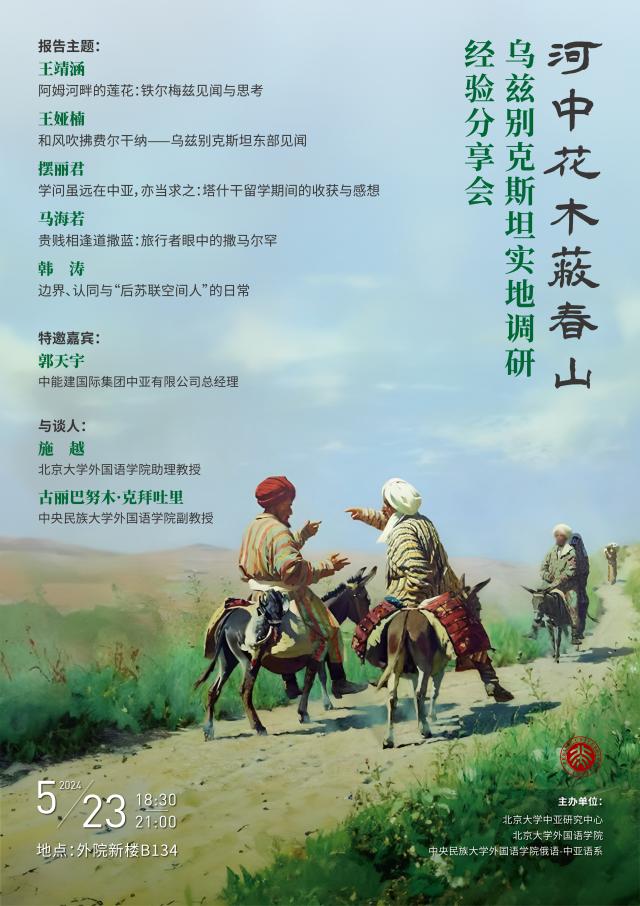 2024年5月23日晚,由北京大学中亚研究中心、米兰官方网站,米兰milan(中国)、中央民族大学米兰官方网站,米兰milan(中国)俄语—中亚语系主办的“河中花木蔽春山:乌兹别克斯坦实地调研经验分享会”在北京大学外院新楼B134会议室顺利举办。中央民族大学米兰官方网站,米兰milan(中国)副教授古丽巴努木·克拜吐里、米兰官方网站,米兰milan(中国)国别和区域研究专业助理教授施越出席,来自北京大学、中央民族大学的同学就乌兹别克斯坦实地调研经验进行了报告分享,会议特邀中能建国际集团中亚有限公司总经理郭天宇一同交流讨论。