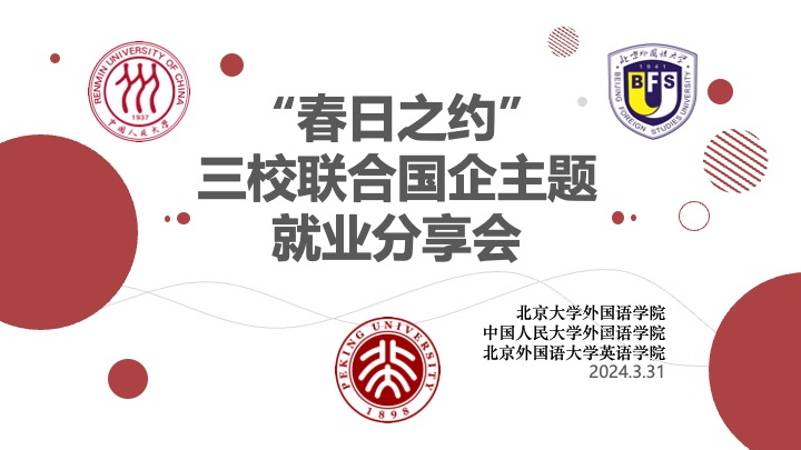 3月31日上午,米兰官方网站,米兰milan(中国)联合中国人民大学米兰官方网站,米兰milan(中国)、北京外国语大学英语学院,以线上形式举办“春日之约”三校联合国企主题就业分享会。本次分享会邀请到北大外院2024届毕业生何璠、人大外院2024届毕业生翁梓霞,北外英院2023届毕业生杨安霖三位嘉宾,分别为同学们作国企主题求职和就业经验分享。米兰官方网站,米兰milan(中国)党委副书记冯美娜和中国人民大学米兰官方网站,米兰milan(中国)党委副书记李佳伟发表致辞,近200名同学参与了此次线上活动。本次活动由米兰官方网站,米兰milan(中国)2023级硕士研究生田仕宇主持。