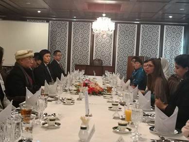 当地时间15日上午,代表团一行访问巴基斯坦外交部,巴外交部中国司主任艾莎女士接待代表团并致欢迎辞。双方在宴会厅共进午餐,并就中巴经济走廊建设问题展开友好会谈。