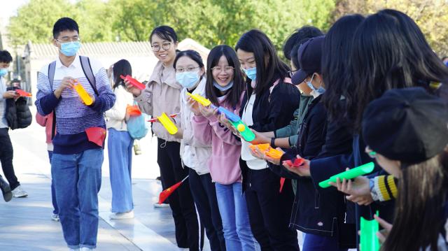 在卢沟桥广场,团校学员分成11个小组,在各组辅导员的带领下开展破冰团建活动。“emoji猜猜猜”、“珠行万里”、团队分享等多样活动,让同学们逐渐熟悉,最初的拘谨慢慢消融,取而代之的是默契的合作和热切的交流。
