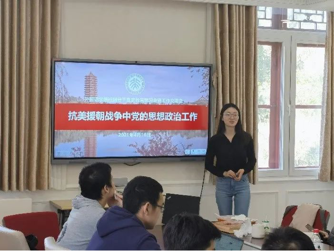 在本期“骨干讲党课”活动中,2019级朝韩语系硕士生孙启同学为大家带来一堂精彩的微党课,带领同学们学习了抗美援朝战争中的思想政治工作。她首先回顾了朝鲜战争的历史概要,并结合各类历史文献向同大家介绍了党在作战中的绝对领导作用。接着,孙启同学通过展示大量珍贵历史文物,从以抗美援朝为中心的国际主义与爱国主义教育、不畏艰难困苦和流血牺牲的革命英雄主义教育、与朝鲜人民同甘共苦的伙伴精神等多个角度讲解了党在这场战争中的思想教育和组织建设工作,让同学们对党的思想和精神有了更深入的理解。