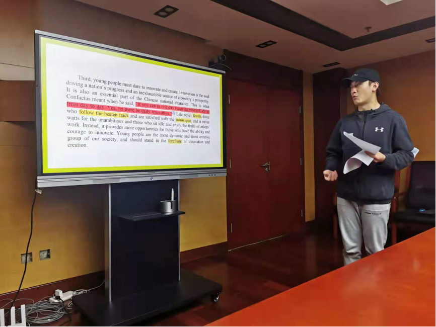 英语班读书会的领读人周孟带领学生们学习了《在实现中国梦的生动实践中放飞青春梦想》。周孟简要介绍了此篇讲话的背景,带领大家学习了文章中的时政热词。他与学生们探讨了“青年”一词的内涵,并讲述了我国历代领导人对于“青年”与“五四精神”的表述。他与同学们交流了各自的梦想,分享了此篇文章对于人生理想的规划与实践的帮助,在交流中,大家都认识到了个人理想与国家命运的紧密关系。