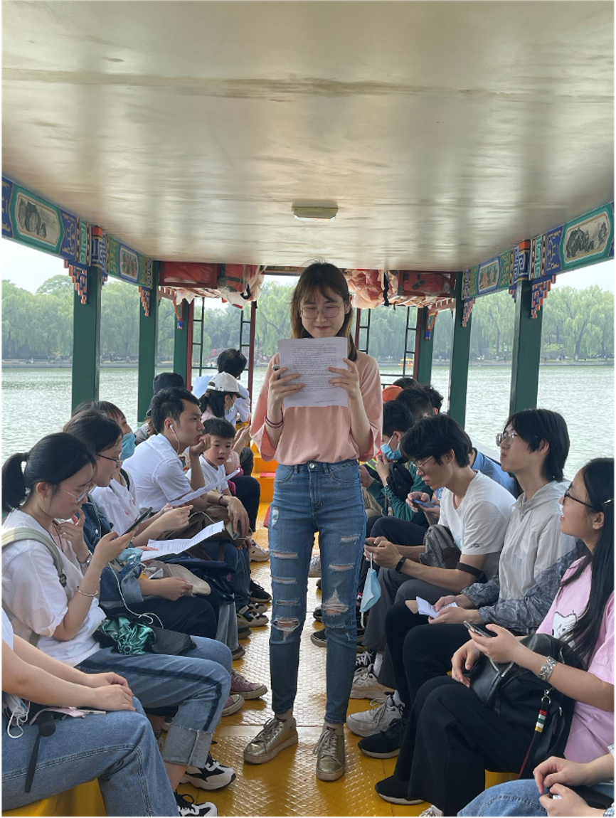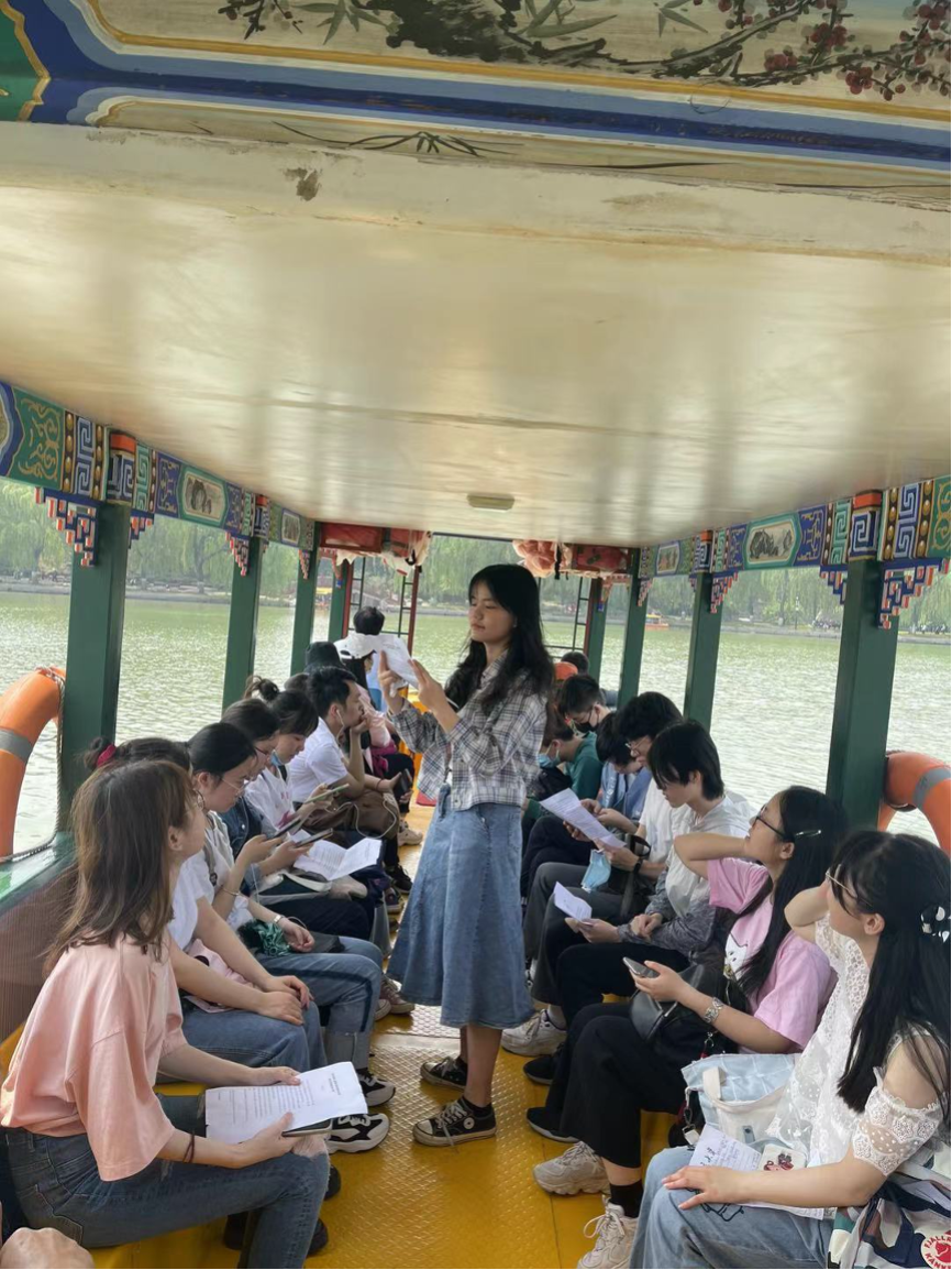 结束了西洋楼遗址的参观后,支部的同学们来到了圆明园湖上的游船中听取卢心然同学精心准备的党课。本次党课以“觉醒一代与我们这一代”为主体,在回忆觉醒年代的奋斗青年们的峥嵘岁月的同时,大家坐在圆明园的“红船”中,身临其境地感受到了党的一大在南湖红船上召开之时的历史氛围。支部成员们在追忆历史的同时,又在卢心然同学的带领下提出了我们作为新一代北大青年、中国青年的历史使命和任务:作为一名外院的学子,我们要不懈努力,在深层次地了解世界各国人民与文化的同时,在多个领域与世界各国进行更高层次上的交流。