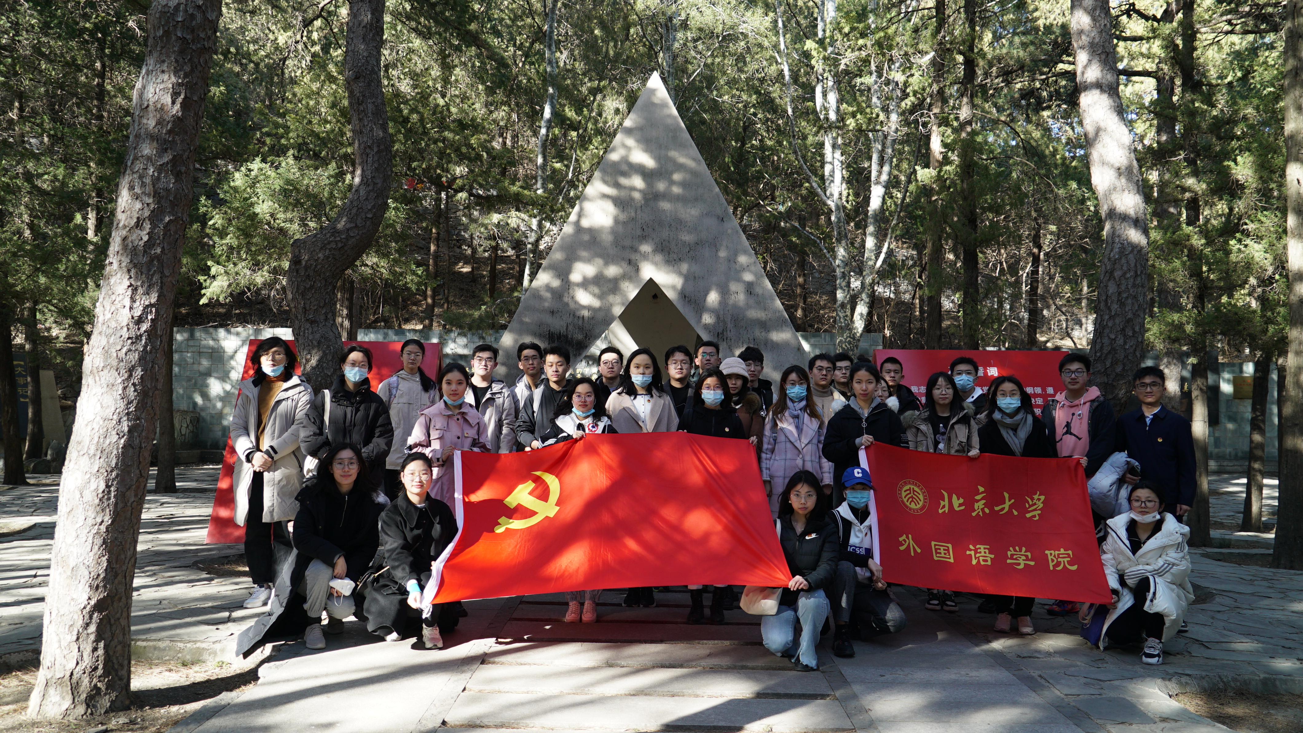 结束李大钊烈士陵园的全部实践行程后,师生一行来到北京植物园,向位于樱桃沟的“一二·九运动纪念亭”进发。虽然寒风凛冽,天气欠佳,但学员们仍然一路欢声笑语,相互鼓励,全员顺利抵达纪念高地。