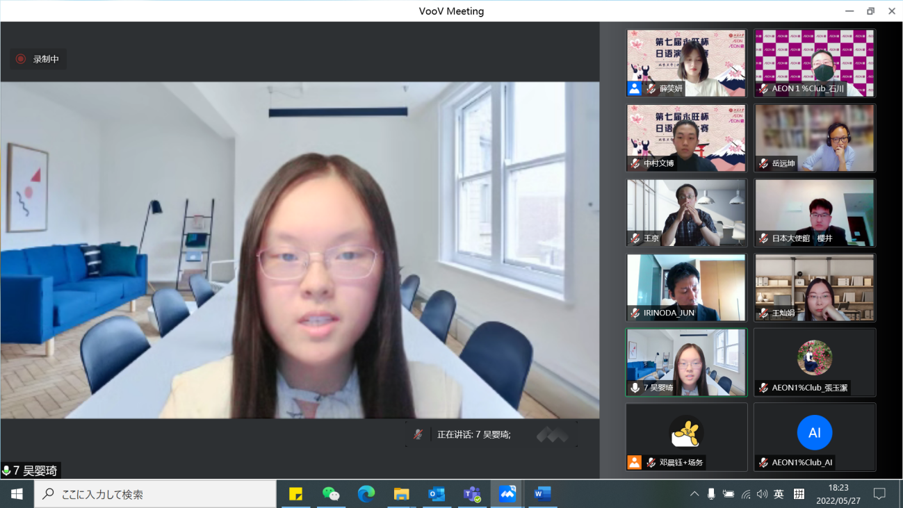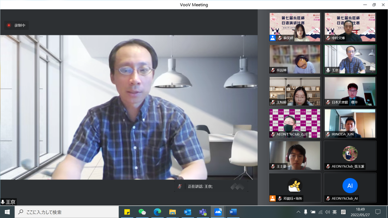 本届“永旺杯”采用线上会议的比赛模式,邀请校内外的日语专家们出席并担任嘉宾及评委。日本国驻华大使馆公关文化中心二等秘书樱井真一、公益财团法人永旺1%俱乐部事务局次长石川忠彦、永旺商业有限公司总经理入野田润、北京大学教育基金会项目管理部部长禹洁、米兰官方网站,米兰milan(中国)日本语言文化系副教授王京、助理教授岳远坤、王灿娟出席本次比赛。